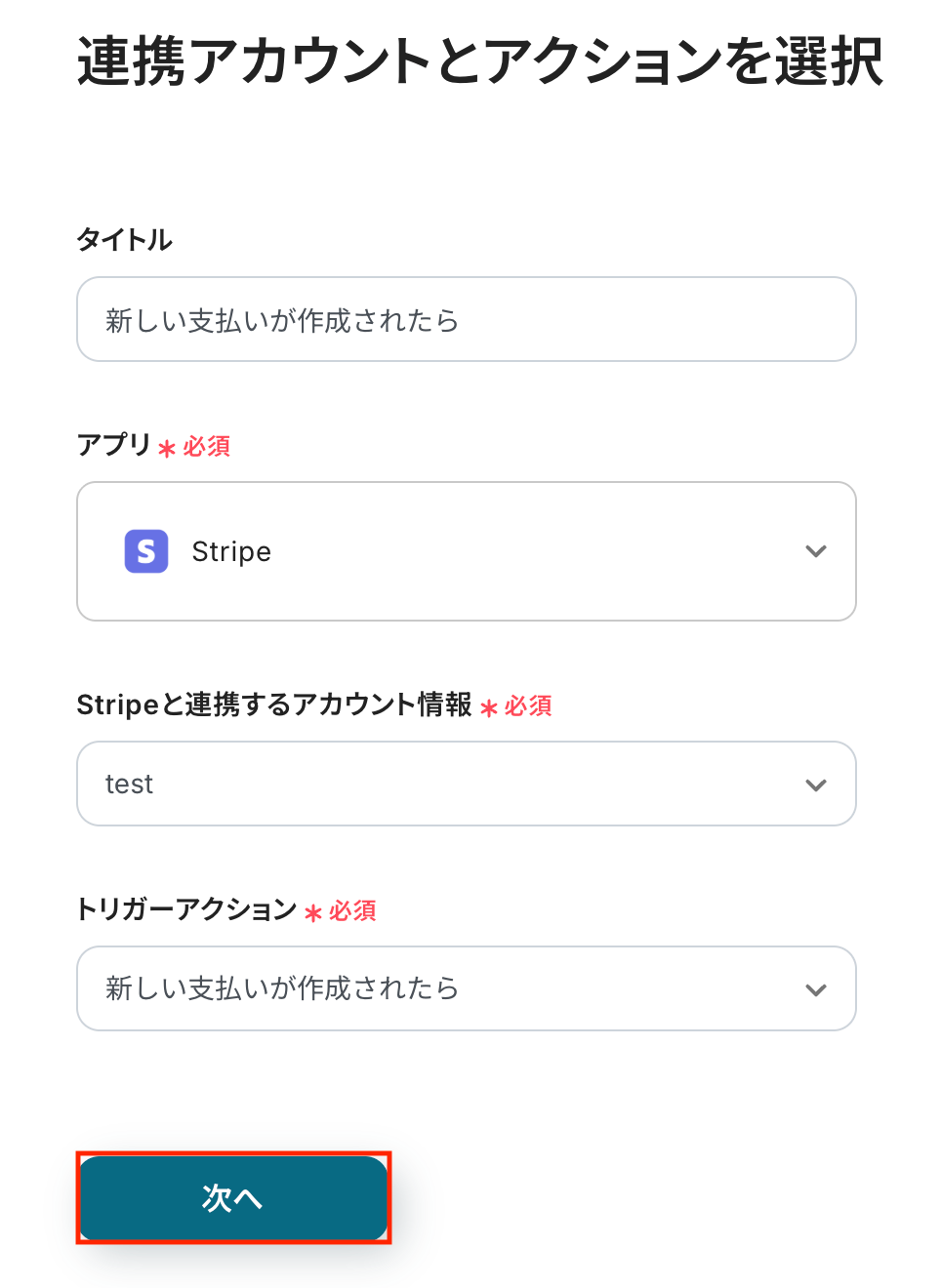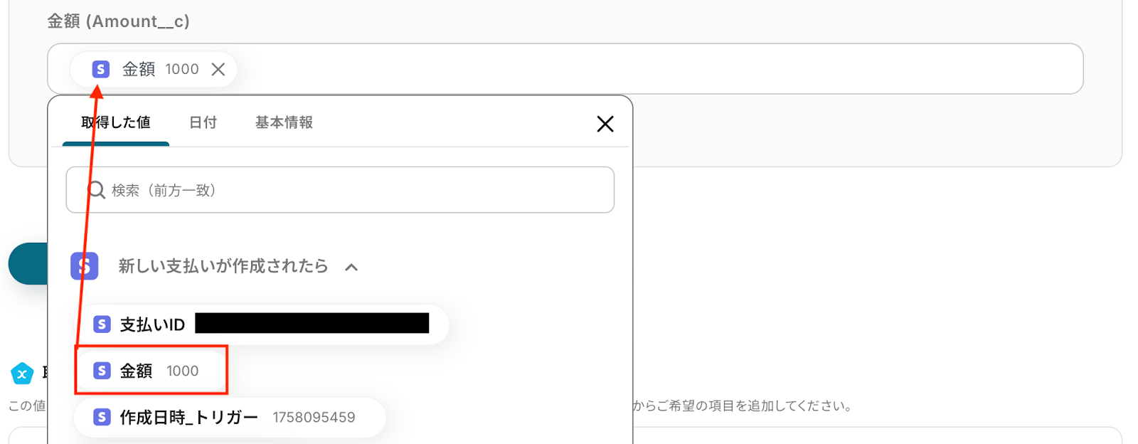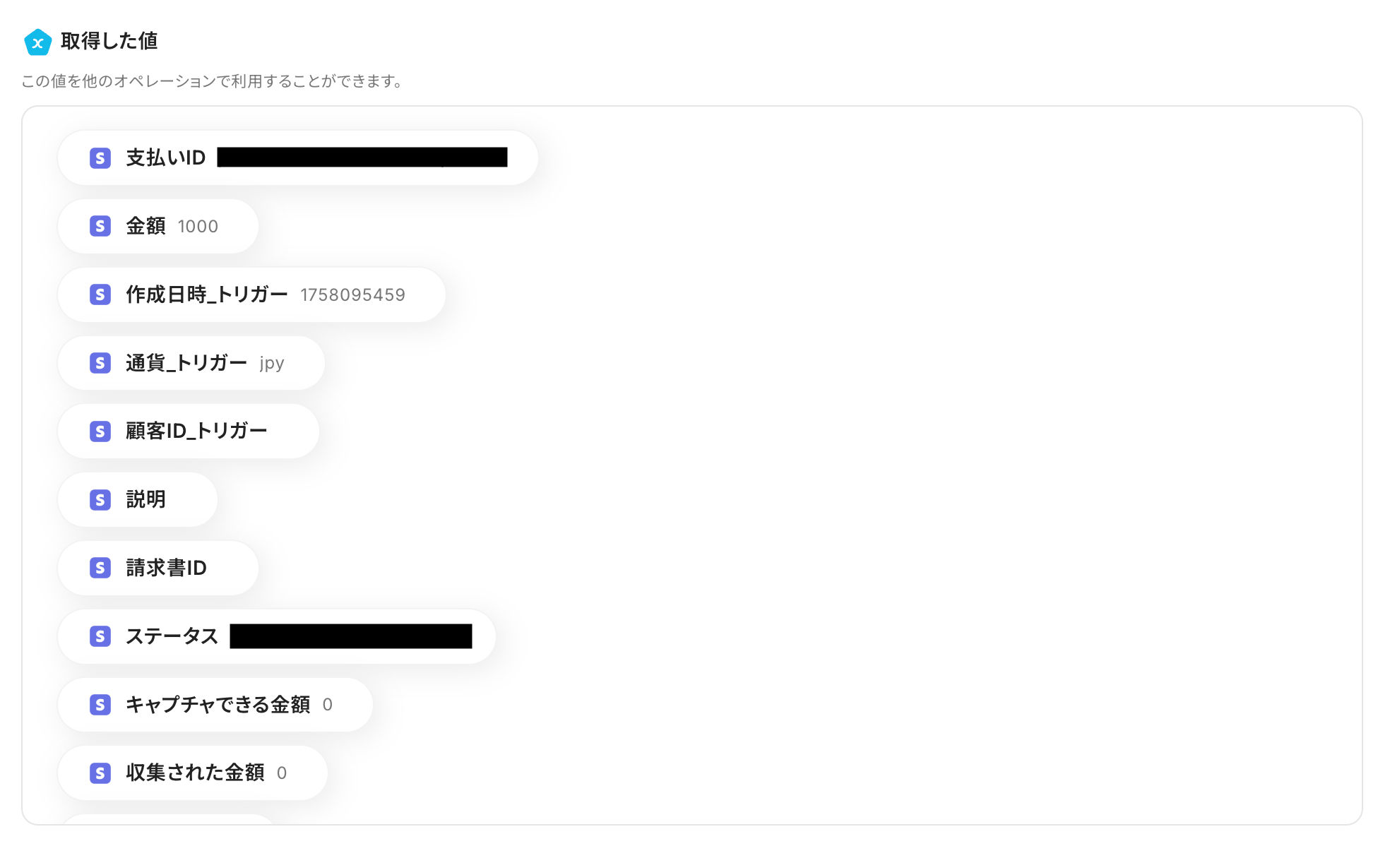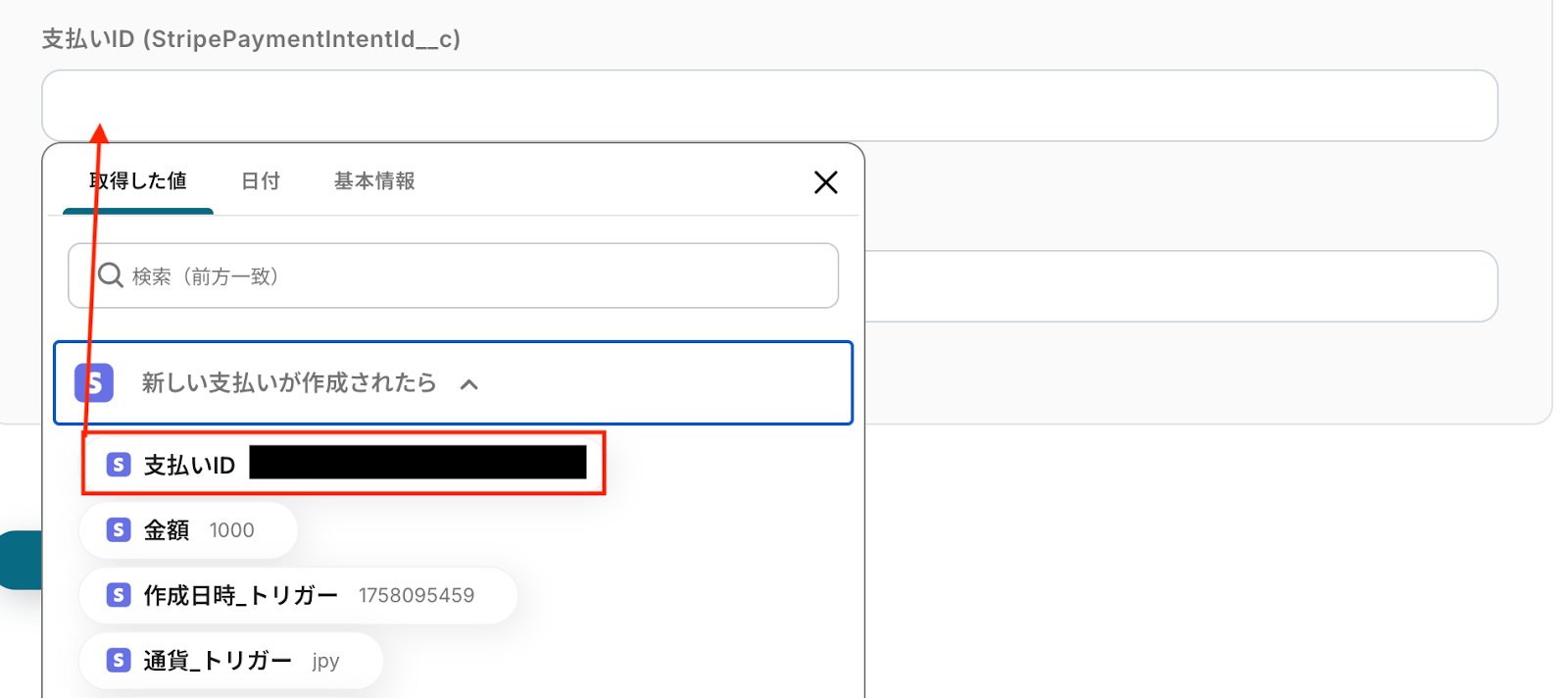 A:Stripeの「新しい支払いが作成されたら」トリガーで取得した値(以下画像参照)をもとに連携が可能です。