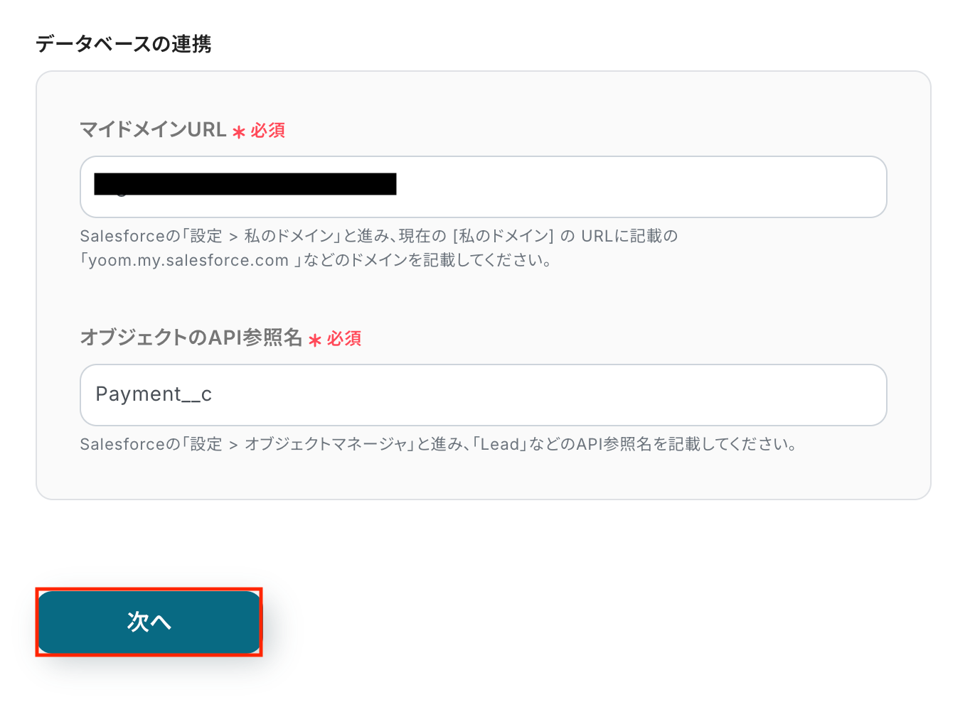 Salesforceと連携するアカウント情報に問題がなければ、「次へ」をクリックします。
