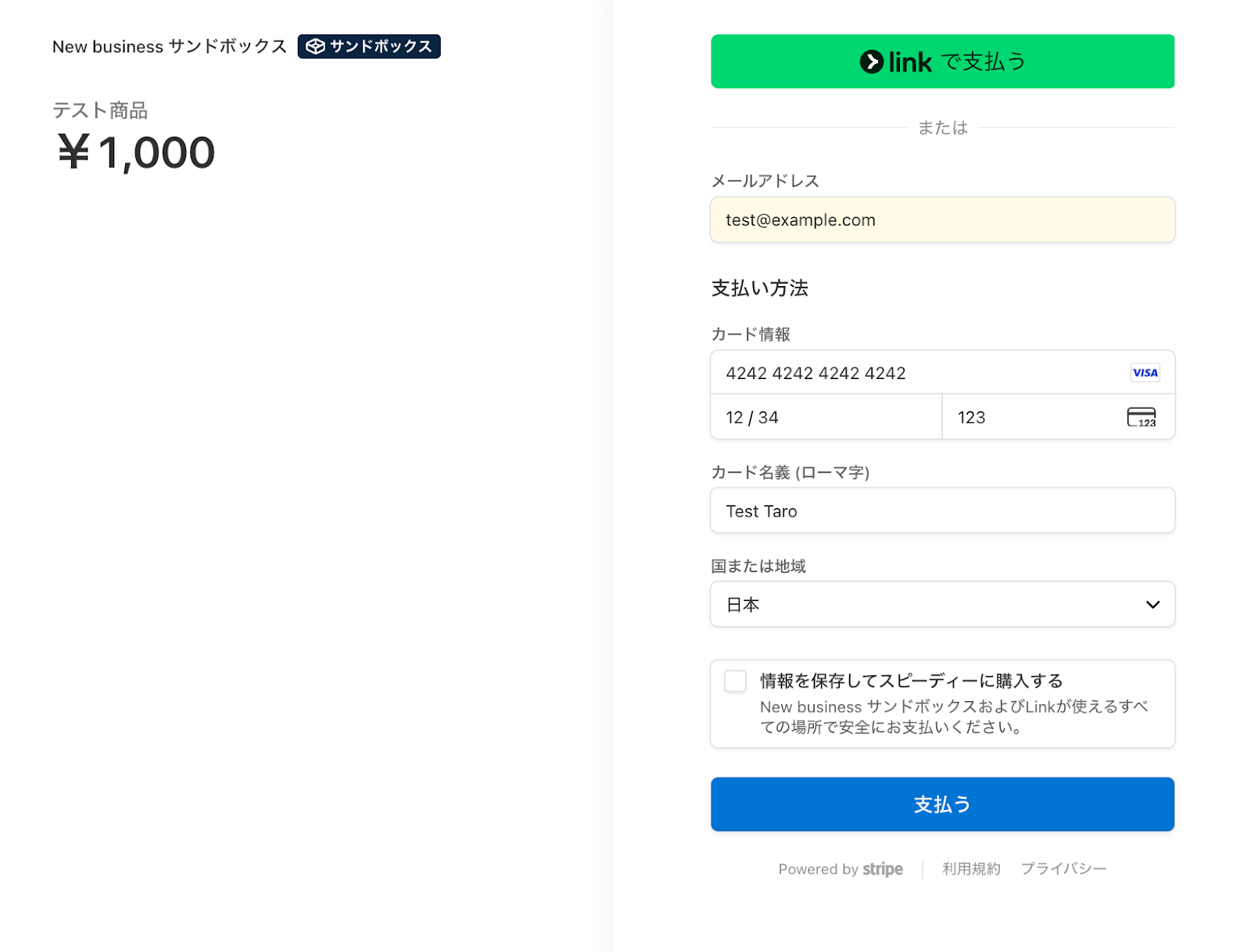 テスト用に、Stripeで新しい支払いを作成しておきましょう。