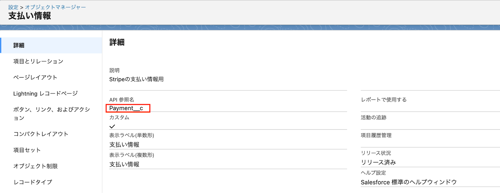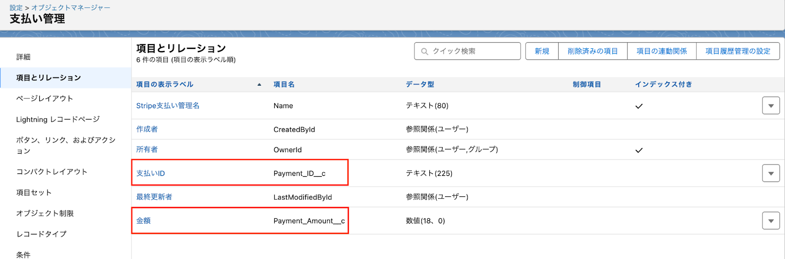 事前準備として、トリガーイベントで取得した新しい支払いの内容をSalesforce側に連携させるため、カスタムオブジェクトを作成しておきましょう。