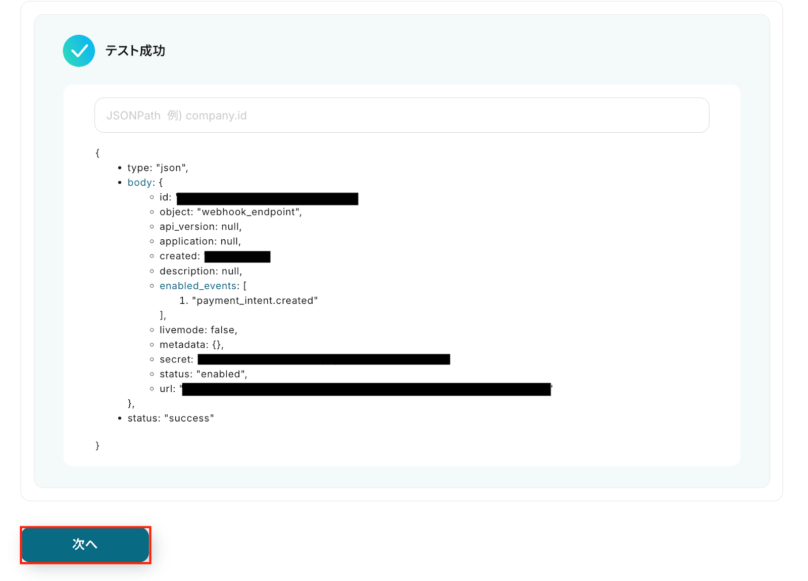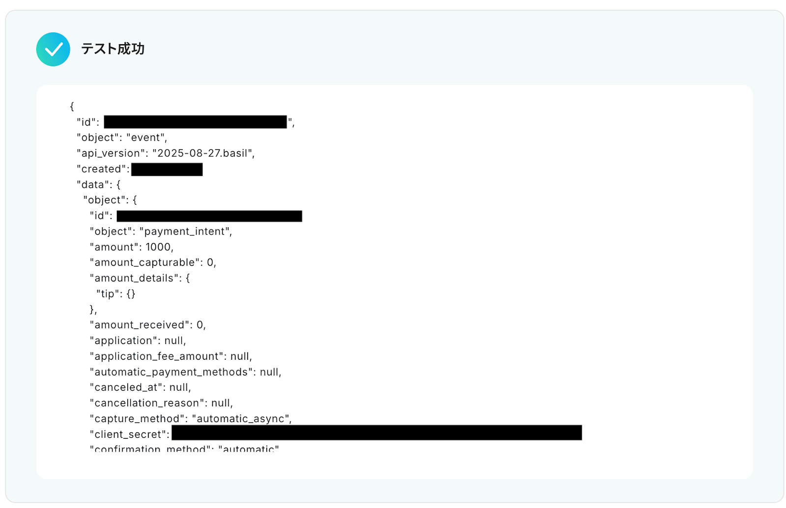 StripeとYoomのWebhook接続に問題なければ、以下のように「テスト成功」のメッセージが表示されます。