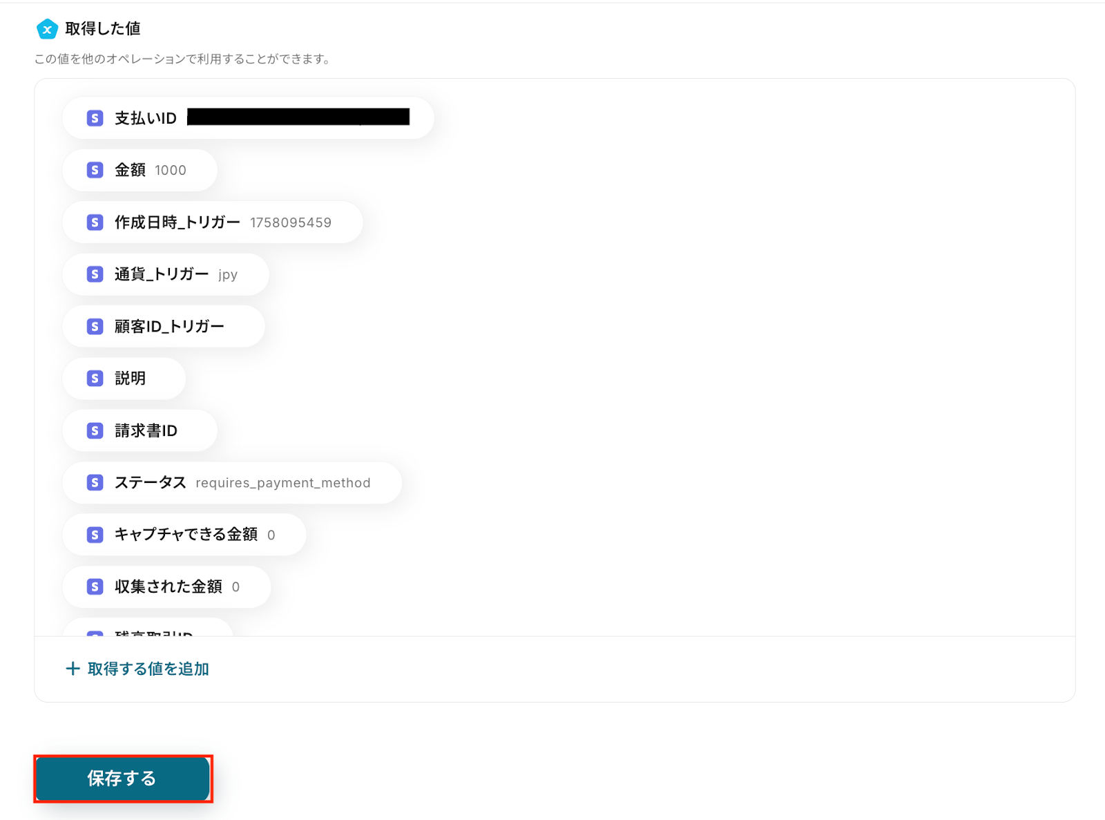 これらのフィールドに、Stripeから取得した項目を紐づけて登録できます。