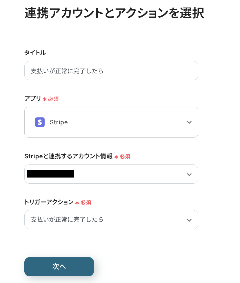 まずは、Stripeで支払い処理が正常に完了した際に、フローが起動するように設定を行います。