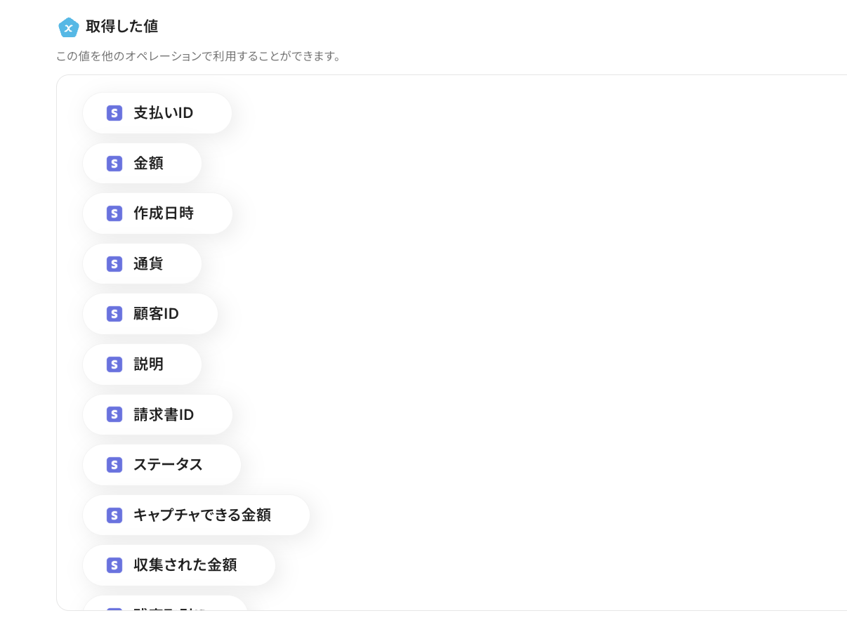 また、トリガー直下に「支払い情報を取得」オペレーションを追加する事で、より詳細な情報を連携できるようになりますよ!