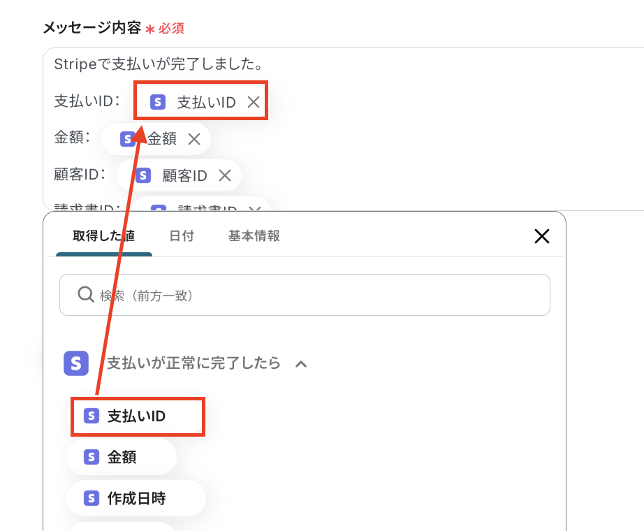「Stripeで支払いが完了しました。」など、毎回同じ文章を使用する定型的なテキストは直接入力し、「金額」や「支払いID」などStripeの情報を引用したい部分は、アウトプットを使って設定してくださいね!