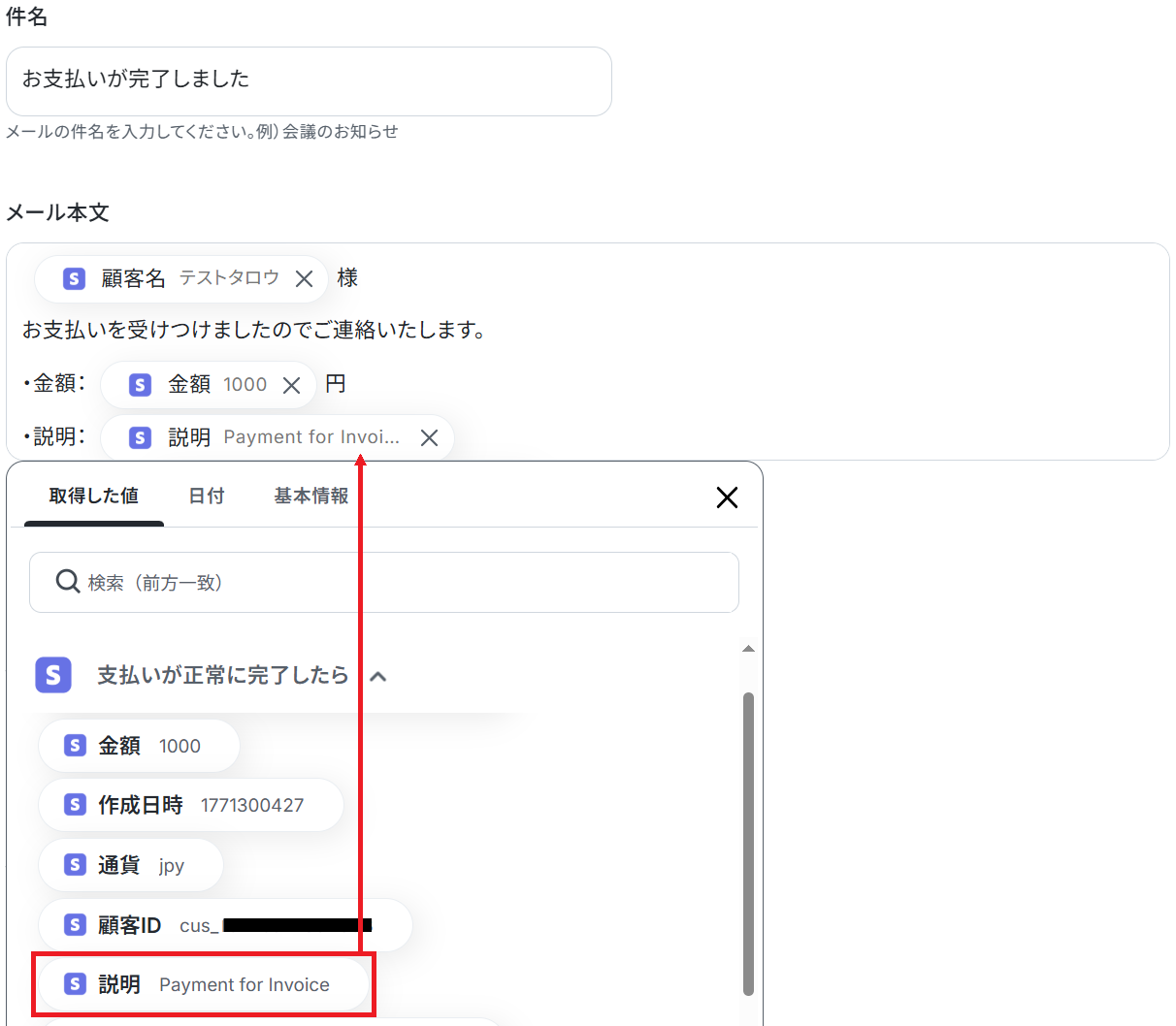 Stripeから取得した値や、固定の文章を組み合わせて自由にカスタマイズ可能です。