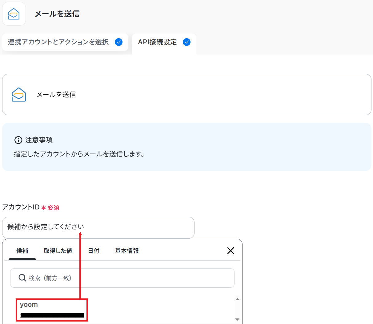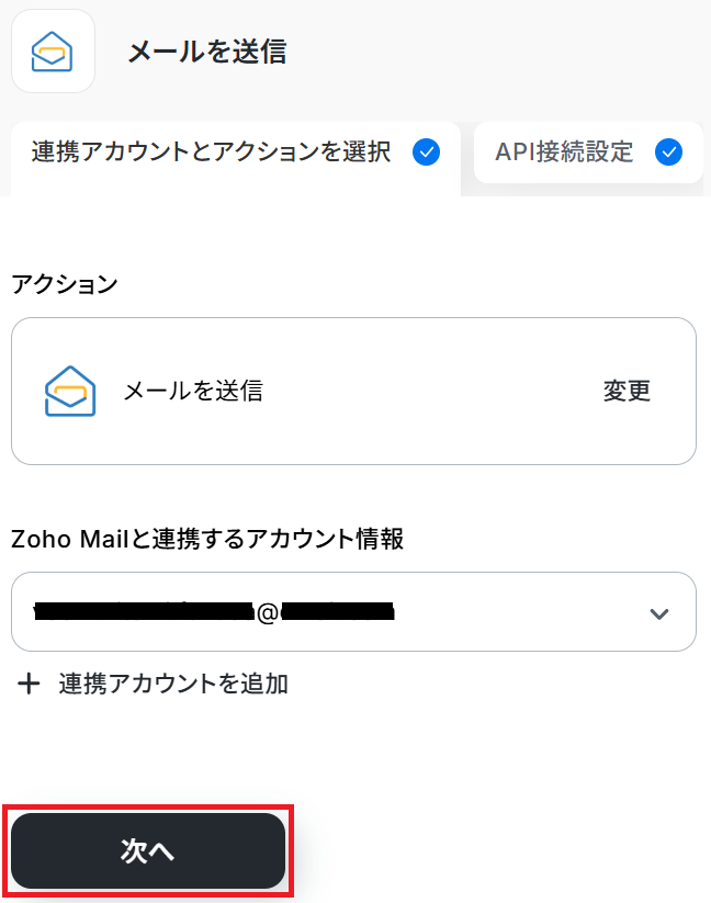- Zoho Mailでメールを送信するアクションでは、送信元として連携した任意のアカウントIDを設定可能です。また、送信先のメールアドレスや件名、本文の内容も自由にカスタマイズしてください