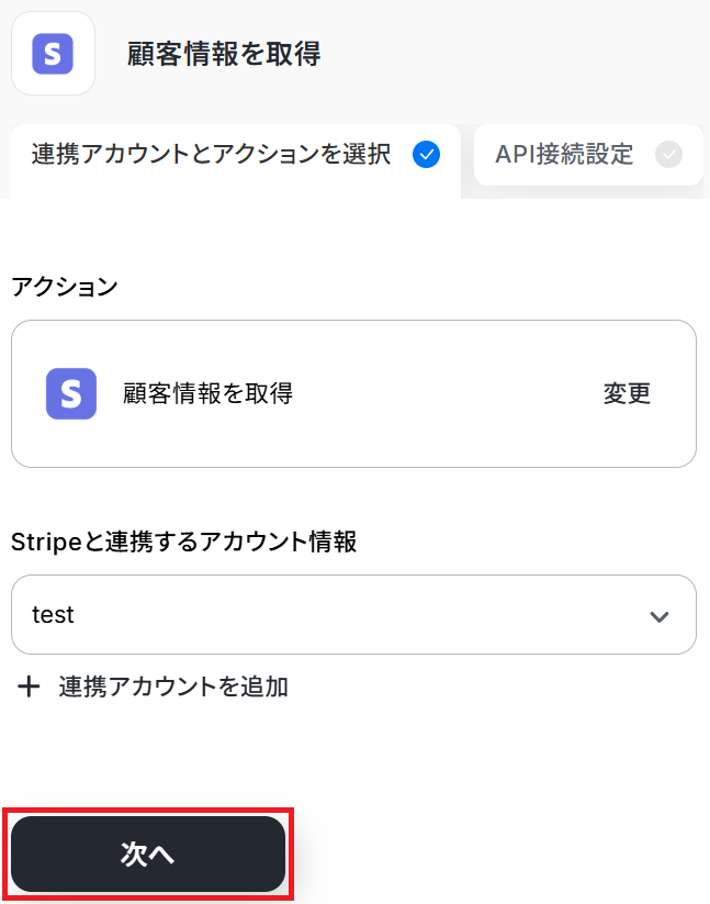 ステップ3と同様、アクションは「顧客情報を取得」のまま「次へ」をクリックします。