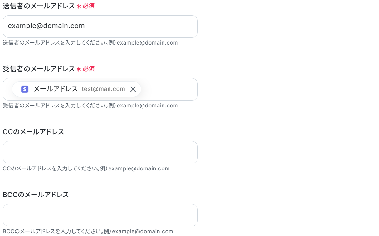 受信者のメールアドレスの欄には、Stripeから取得した「メールアドレス」の値が既に設定されているのでそのままで大丈夫です。CC・BCCの設定もできます。
