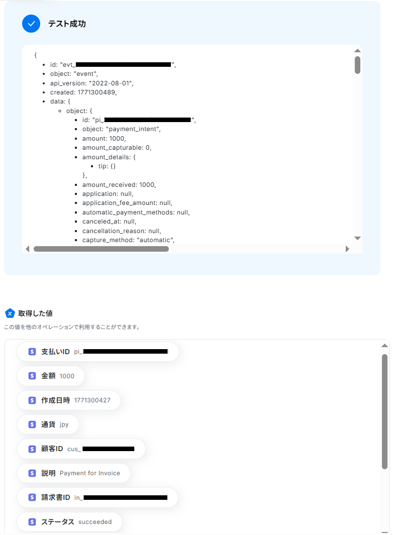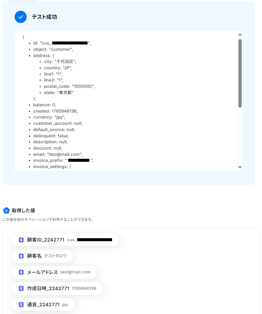 顧客IDの欄には、トリガーで取得した「顧客ID」の値が予め設定されているのでそのままテストしてください。