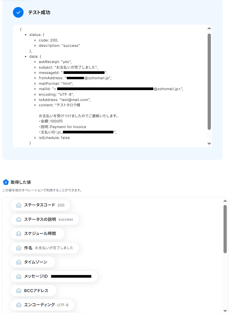 連携したZoho Mailアドレスから、支払い完了通知が送信されました!