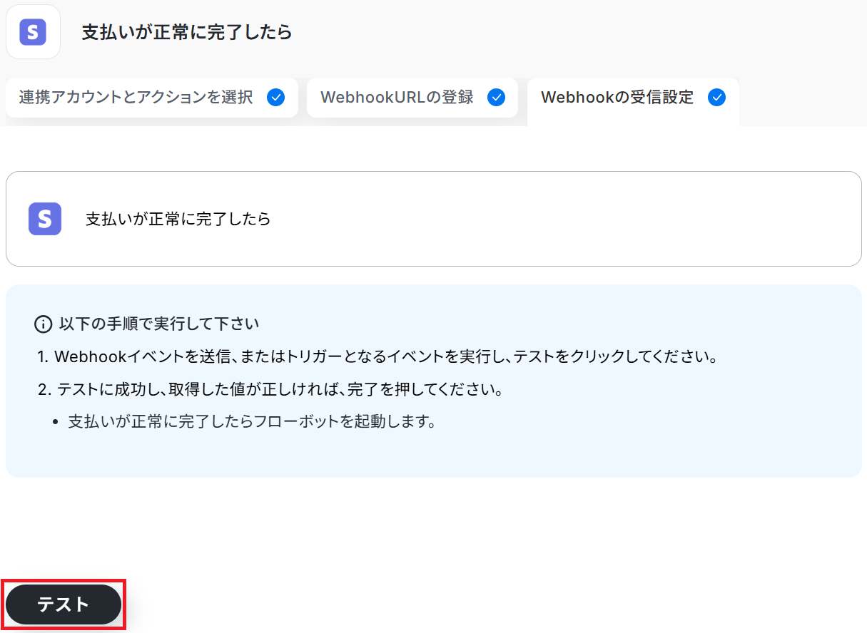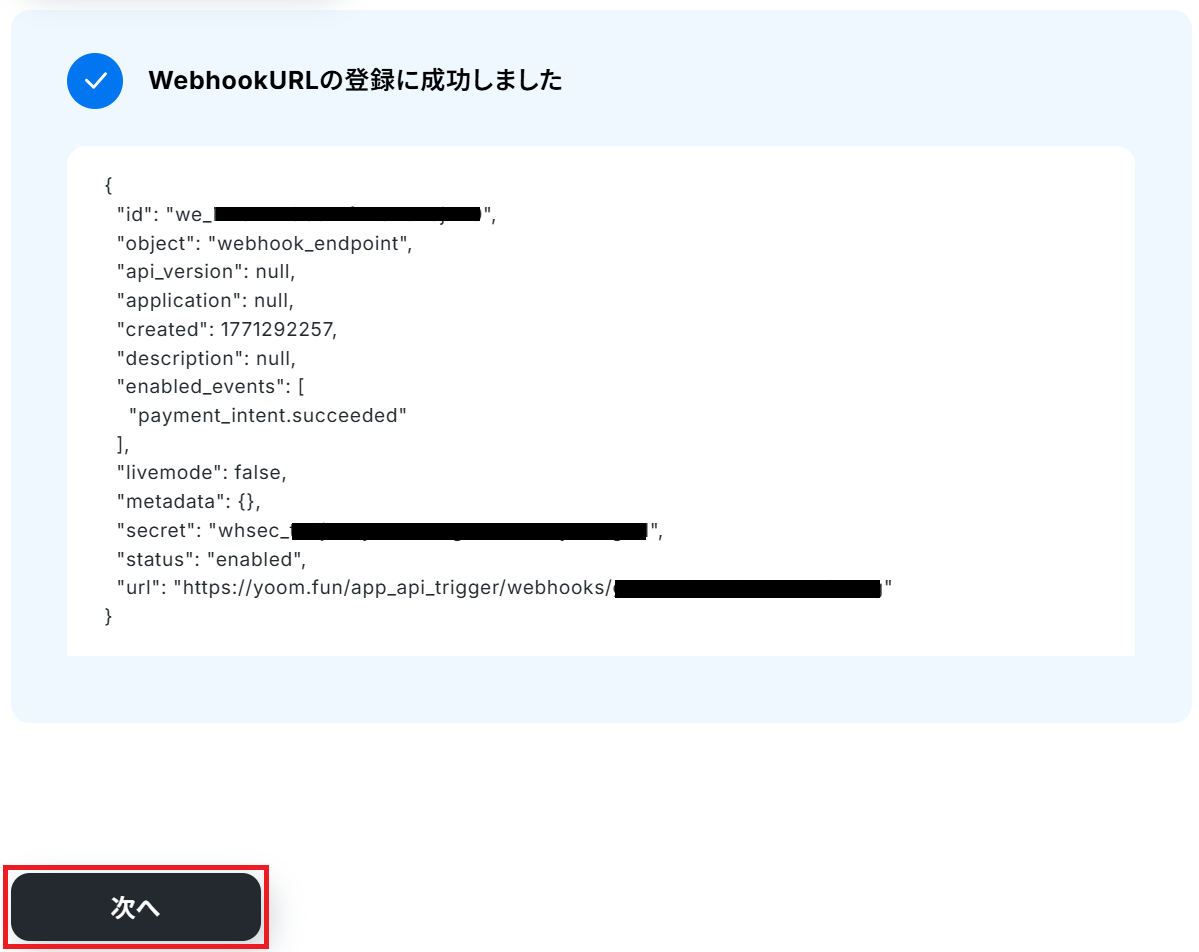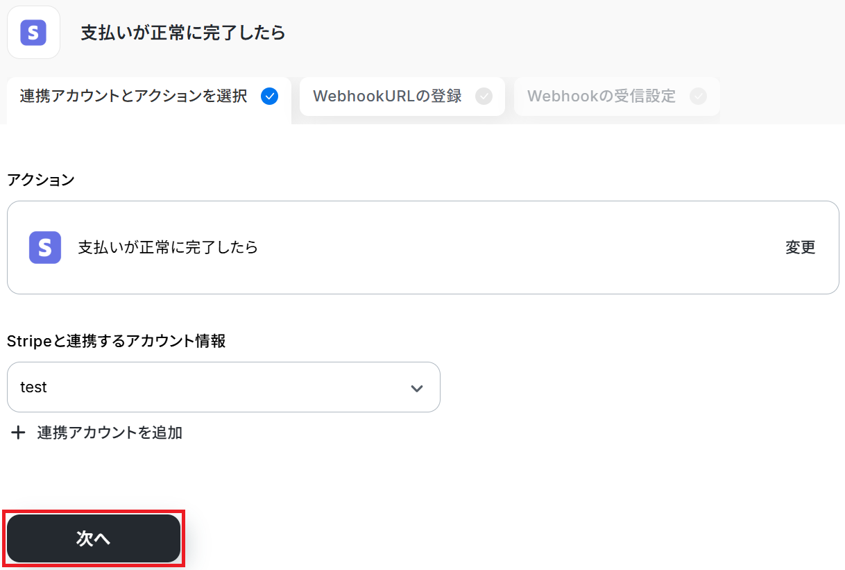 タイトルと連携するアカウント情報を任意で設定し、アクションはテンプレート通りに「支払いが正常に完了したら」のまま「次へ」をクリックします。