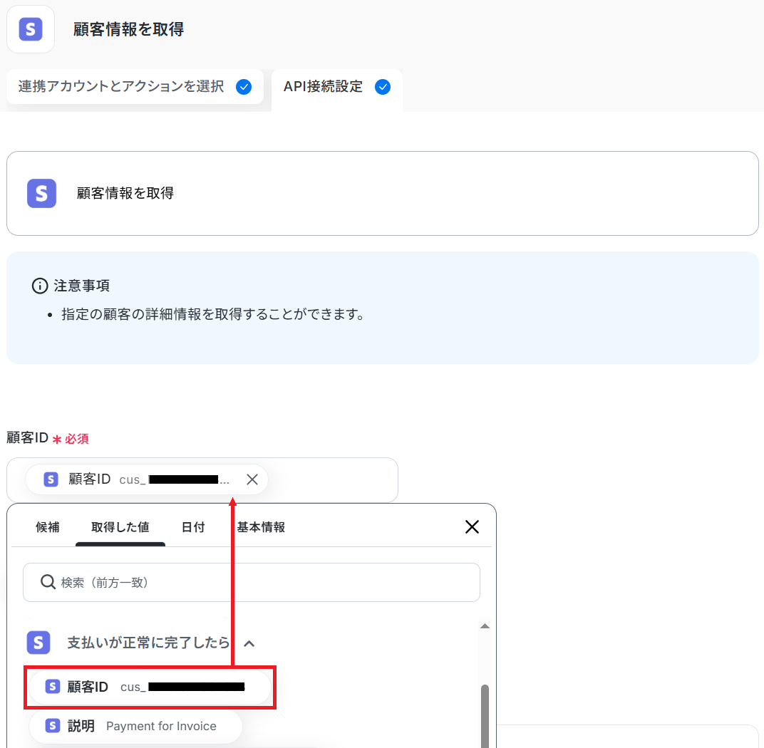 - 続いて、オペレーションでStripeの「顧客情報を取得」アクションを設定し、支払いを行った顧客の情報を取得します。