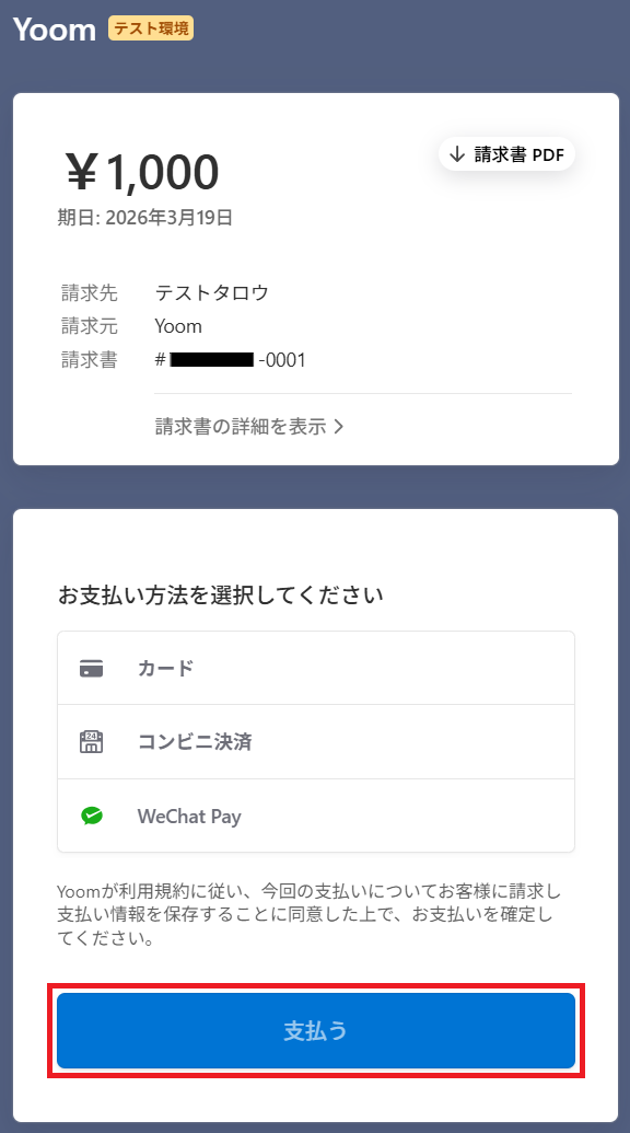 ここまできたら一旦Stripeに移り、テスト用の支払いをしてください。
