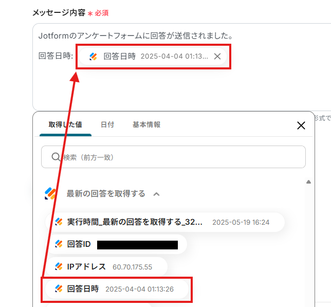 「メッセージ内容」は、入力欄をクリックして表示されるアウトプット(取得した値)から選択できます。
