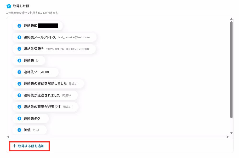 また、「取得した値」にはIDや作成日時などが追加されます。