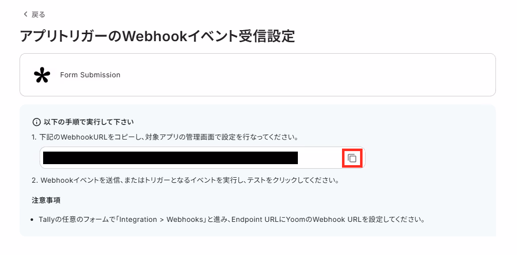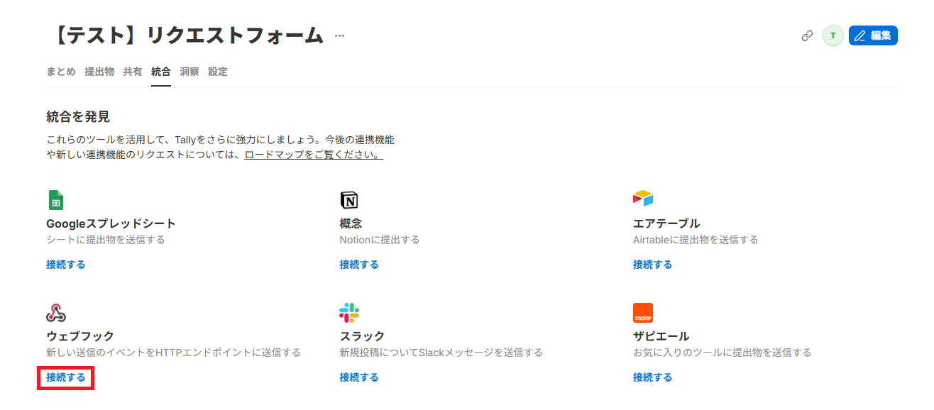 WebhookURLをコピーし、Tallyで任意のフォームにアクセスしてください。