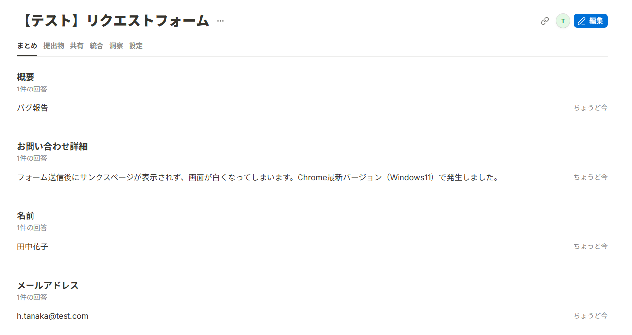 次にテスト操作を行うので、実際にテスト用のフォーム回答を行いましょう。