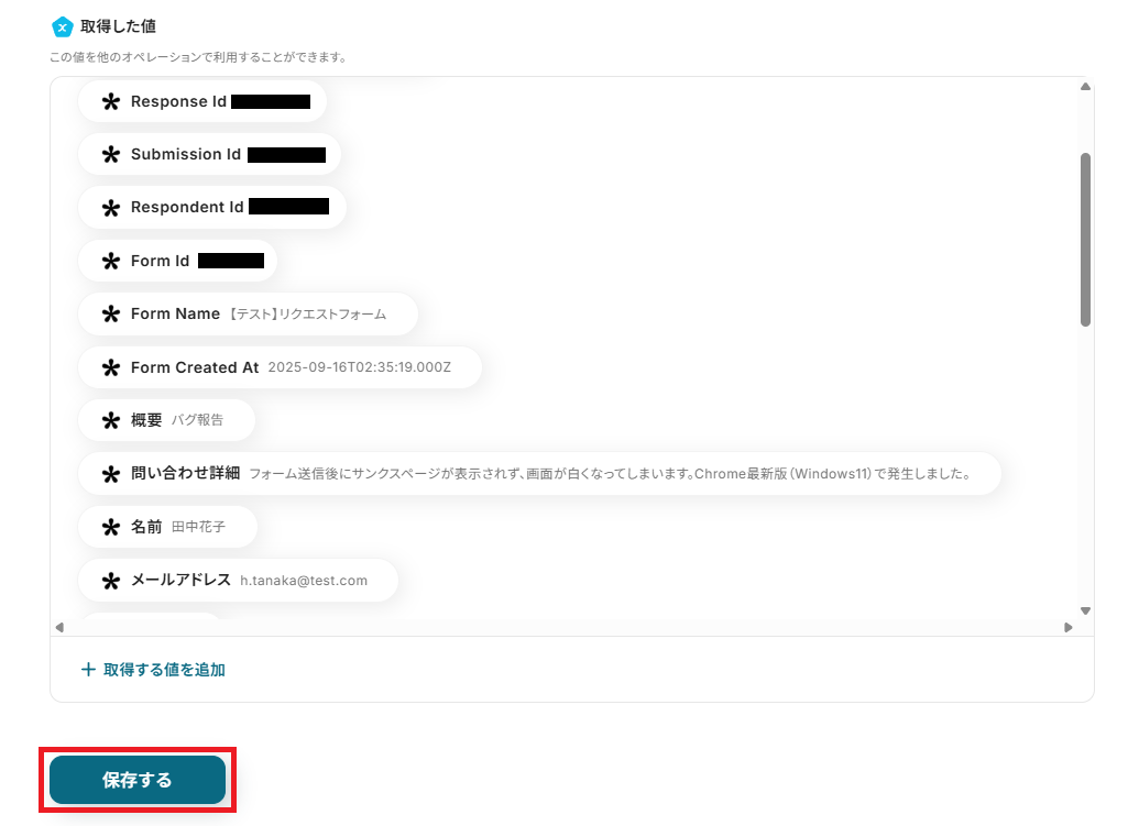 フォーム回答の内容が反映していればOKです。「保存する」を押して次に進みましょう!
