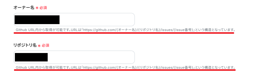 「オーナー名」と「リポジトリ名」は、注釈に沿ってGitHubのURLから確認し入力してください。