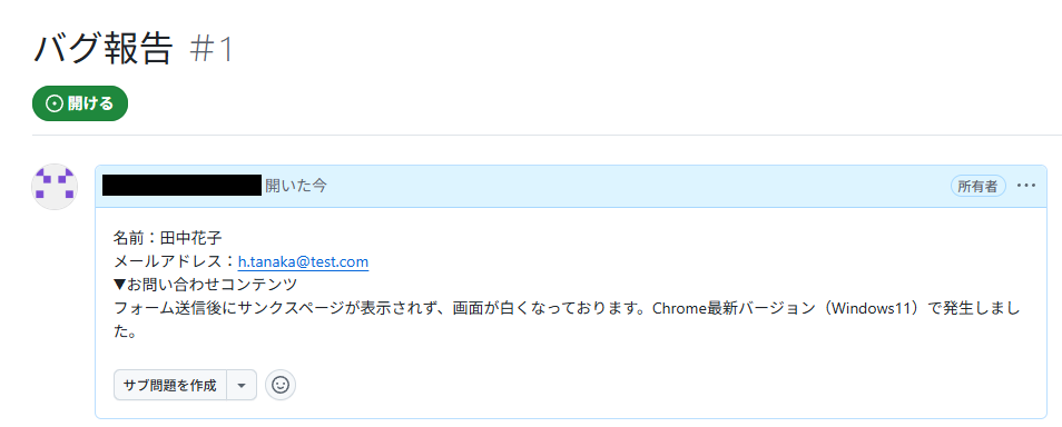 テストに成功すると、Issueが作成されるので確認してみましょう。