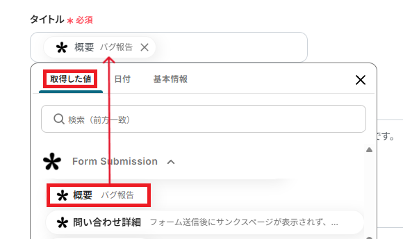 「タイトル」は、入力欄をクリックして表示される取得した値から選択しましょう。