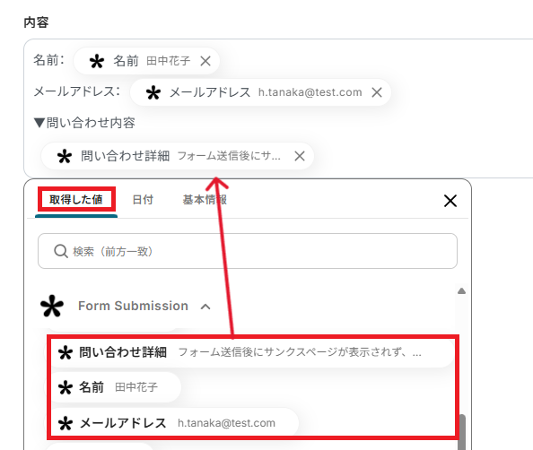 「内容」も、取得した値を利用して設定ができます。