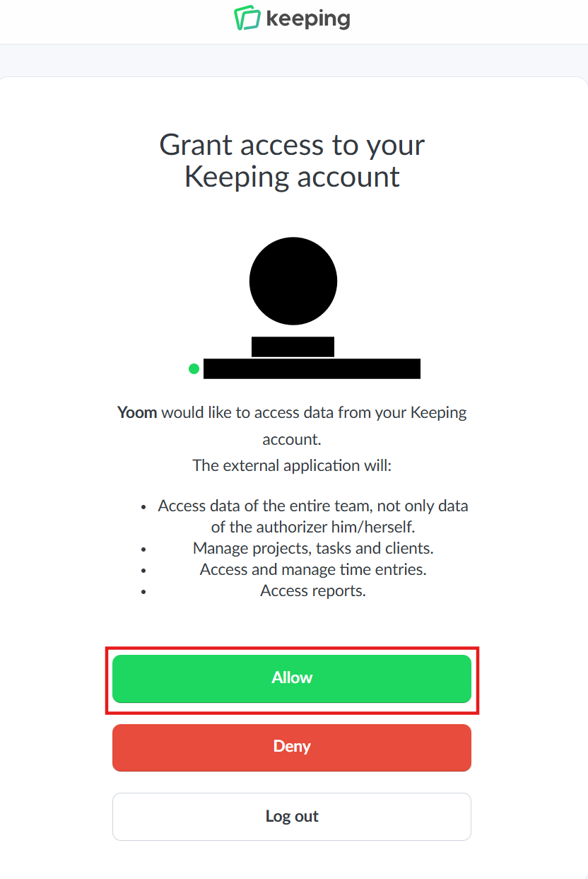 2.YoomがKeepingのデータにアクセスするための許可を求める同意画面が表示されます。