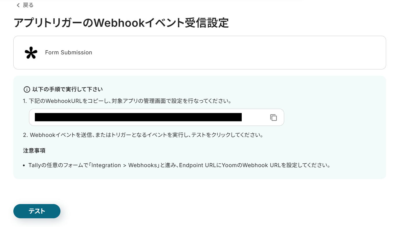Webhook URLをコピーした後、Tallyの画面で設定を行います。