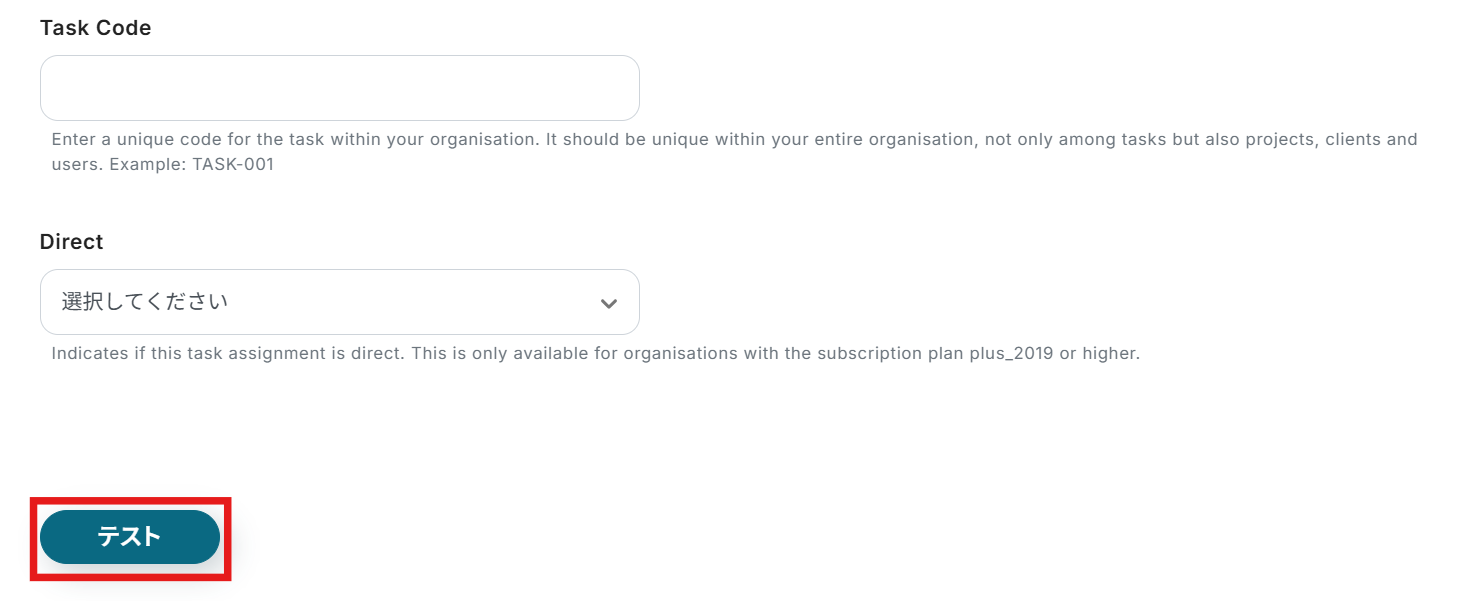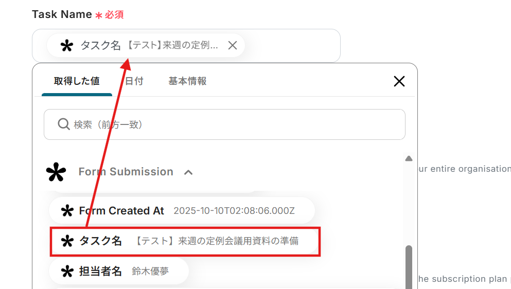 Task Name:タスク名を設定しましょう。入力欄をクリックするとTallyから取得した値を引用できるので、今回はフォームで回答したタスク名を設定しています。