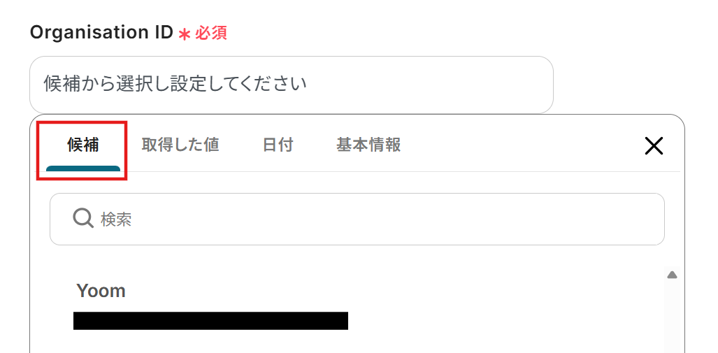 Organisation ID:入力欄をクリックすると候補が表示されるので、その中から選択しましょう。もし候補がうまく表示されない場合は、マイアプリ連携の設定をもう一回チェックしてみてくださいね。