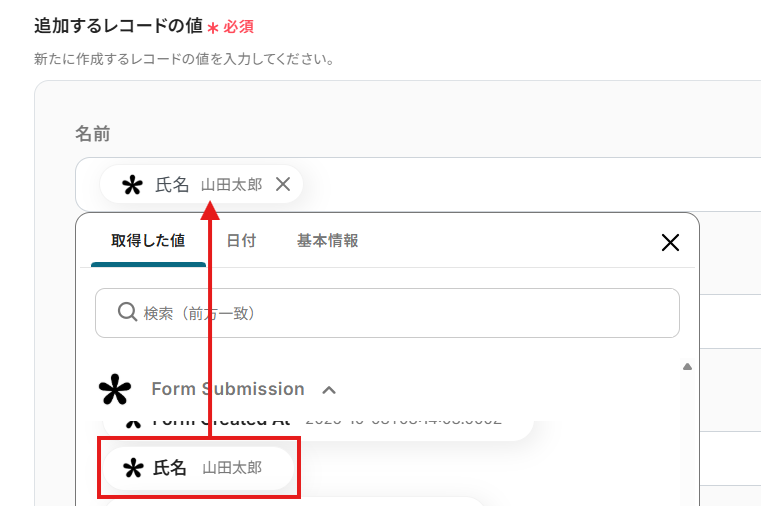 「追加するレコードの値」の各項目は、入力欄をクリックして表示される取得した値から選択してください。