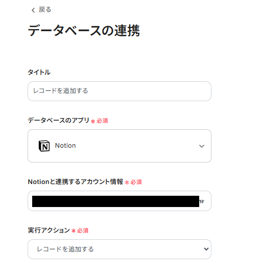 「Notionと連携するアカウント情報」を確認し、「実行アクション」はそのままで、データベースの連携の各項目を設定していきます。