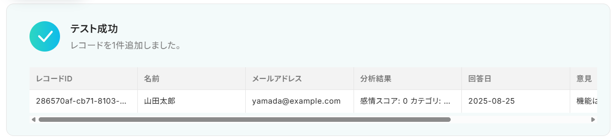 このテンプレートを使えば、Tallyに回答が送信されたらAIが内容を分析・要約し、構造化されたデータとしてNotionに自動で追加するため、情報の集約と分析にかかる時間を短縮し、手作業による転記ミスも防ぎます。