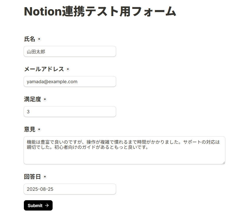 テスト用のため、回答の内容は架空の情報(「株式会社test」や「テスト太郎」など)でOKです!