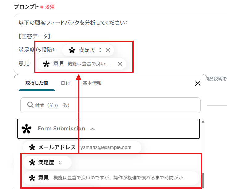 「プロンプト」は、AIへの指示内容をテキストで設定します。入力欄をクリックして表示される取得した値から選択してください。