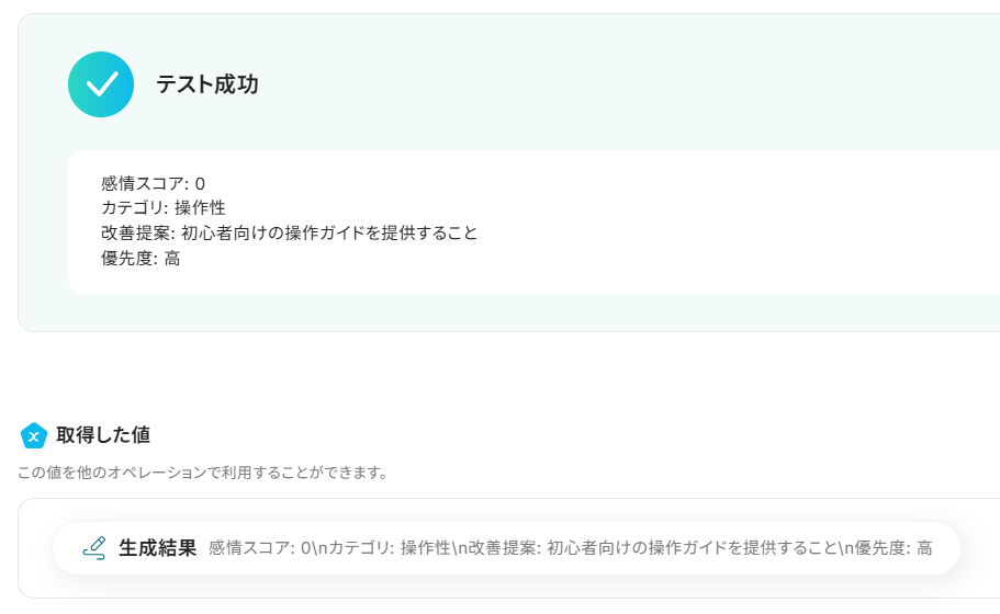 入力が完了したら「テスト」を実行し、正しくテキストが生成されていることを確認しましょう。確認後、「保存する」をクリックします。