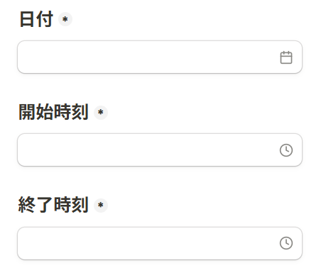 ただし、Googleカレンダーで予定を作成するには、「予定の開始日時」と「予定の終了日時」が必須項目になるので、Tallyのフォームに日付・開始時刻・終了時刻を設けましょう。