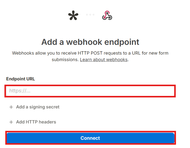 以下の画面が表示されるので、「Endpoint URL」に先ほどYoomの画面でコピーしたWebhookURLをペーストし、「Connect」を選択します。