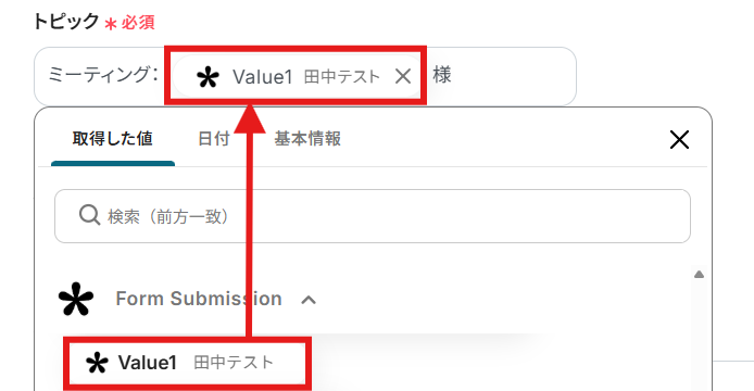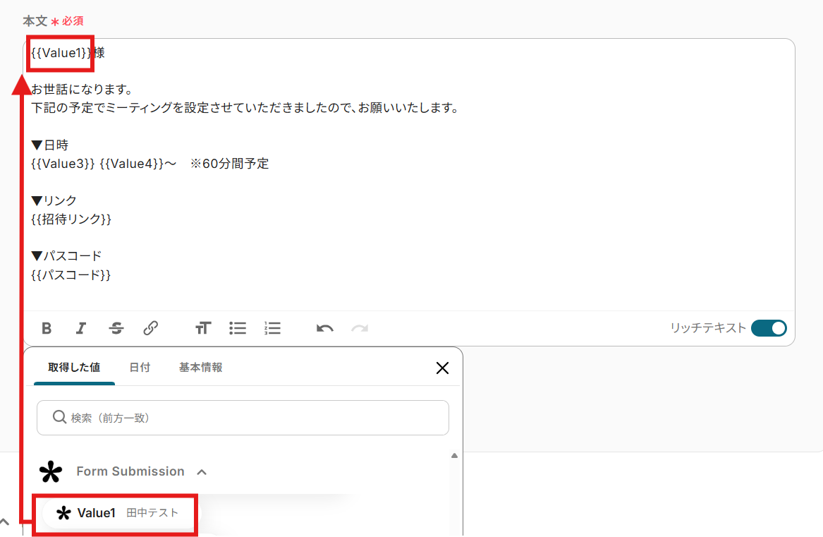 今回は固定でのテキスト入力と「取得した値」を使用して以下のように設定しました!