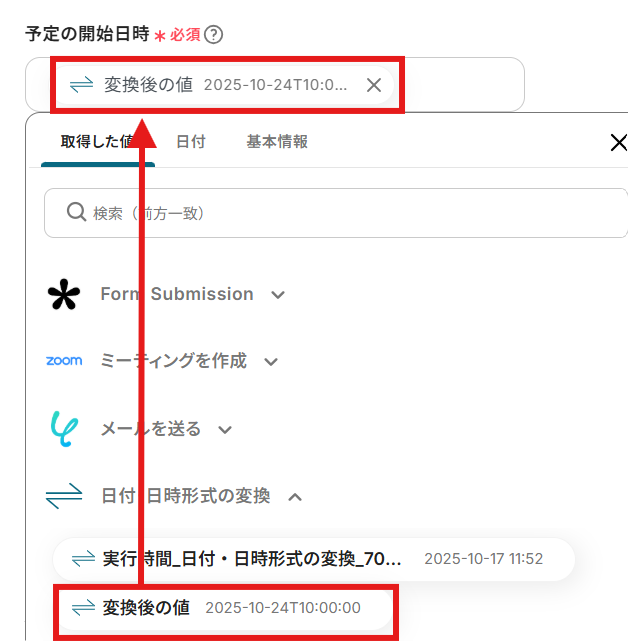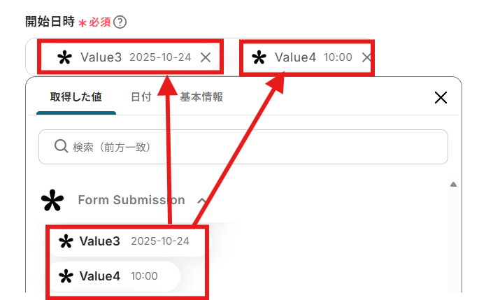 「開始日時」も「取得した値」を利用して設定しましょう。