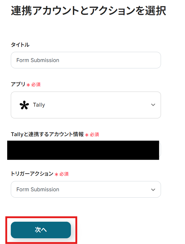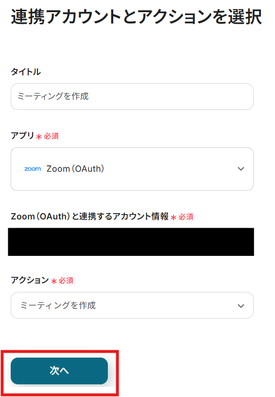 「タイトル」と「連携するアカウント情報」を確認し、「アクション」はテンプレート通りのまま「次へ」をクリックして進んでください。