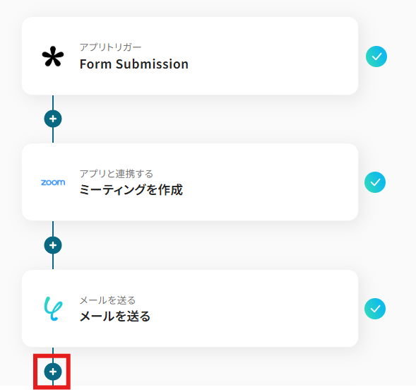 各オペレーションが設定できたら、「+」マークをクリックして、Googleカレンダーの「予定を作成」オペレーションを設定しましょう。