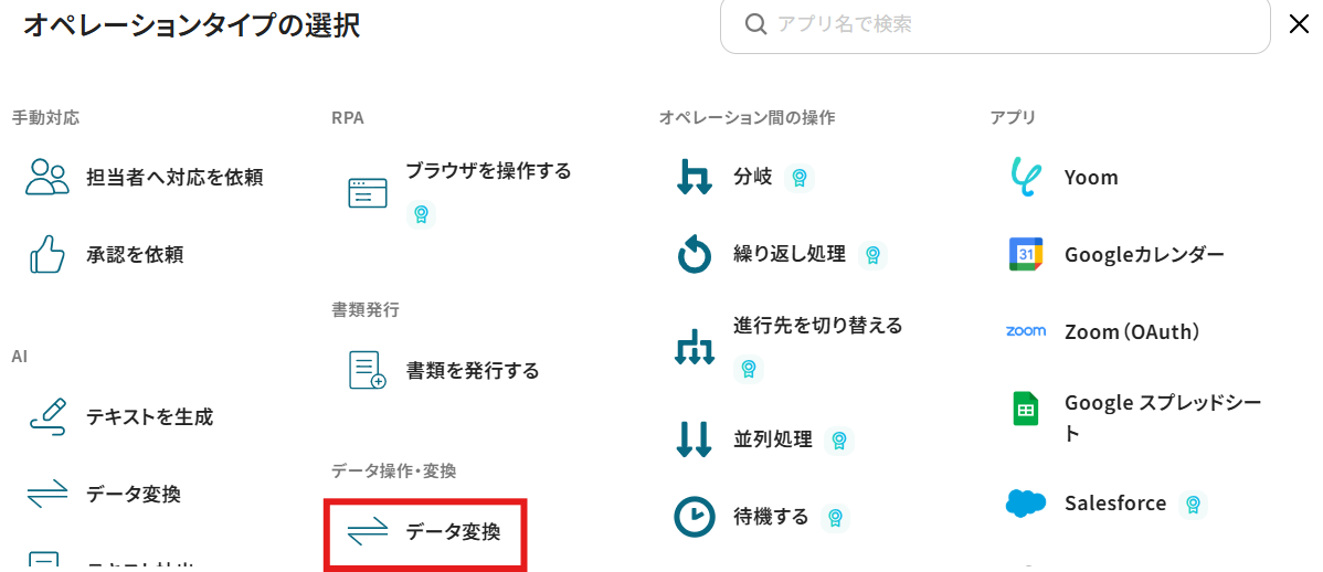 「メールを送る」オペレーションの直下の「+」マークをクリックして、「データ変換」を選択します。