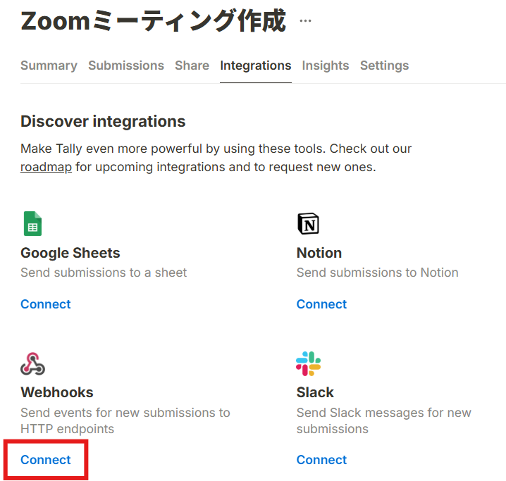 「Webhooks」の「Connect」をクリックしましょう。