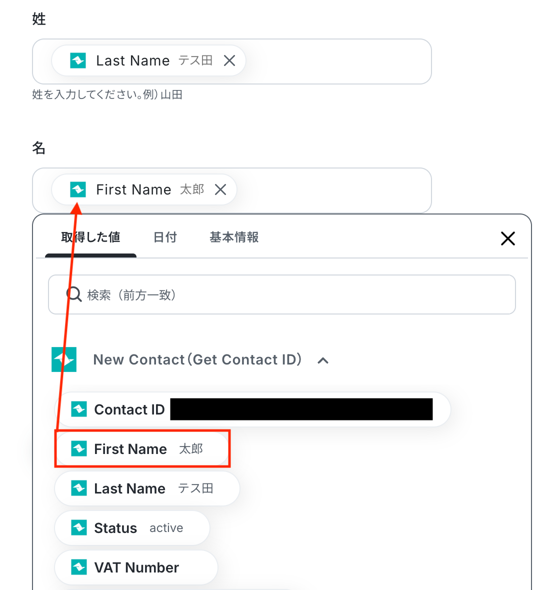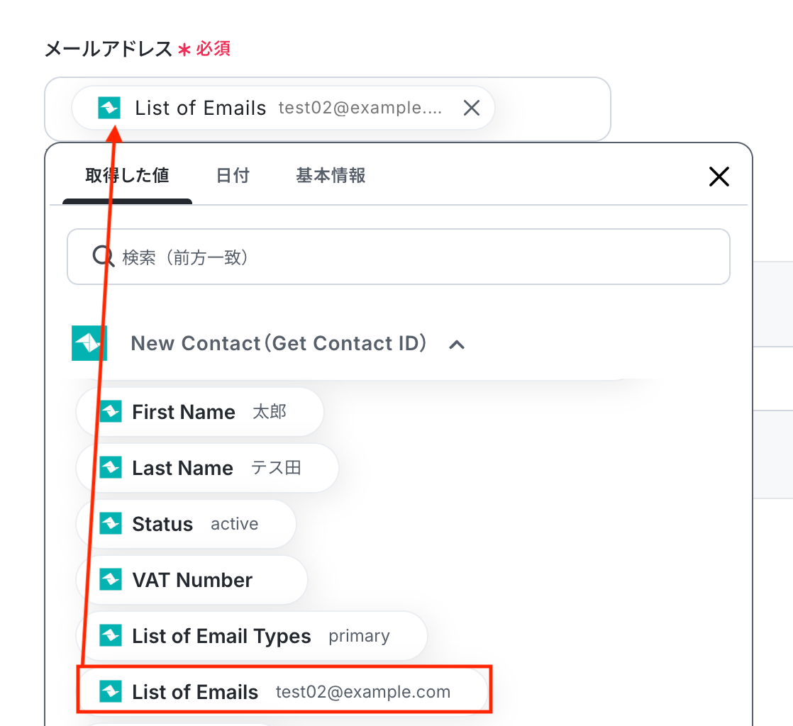 入力欄をクリックすると、前のステップでTeamleaderから取得した値が表示されるので、選択して入力しましょう。