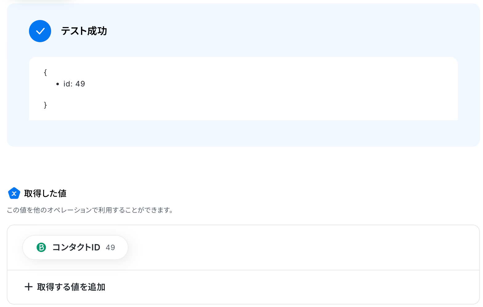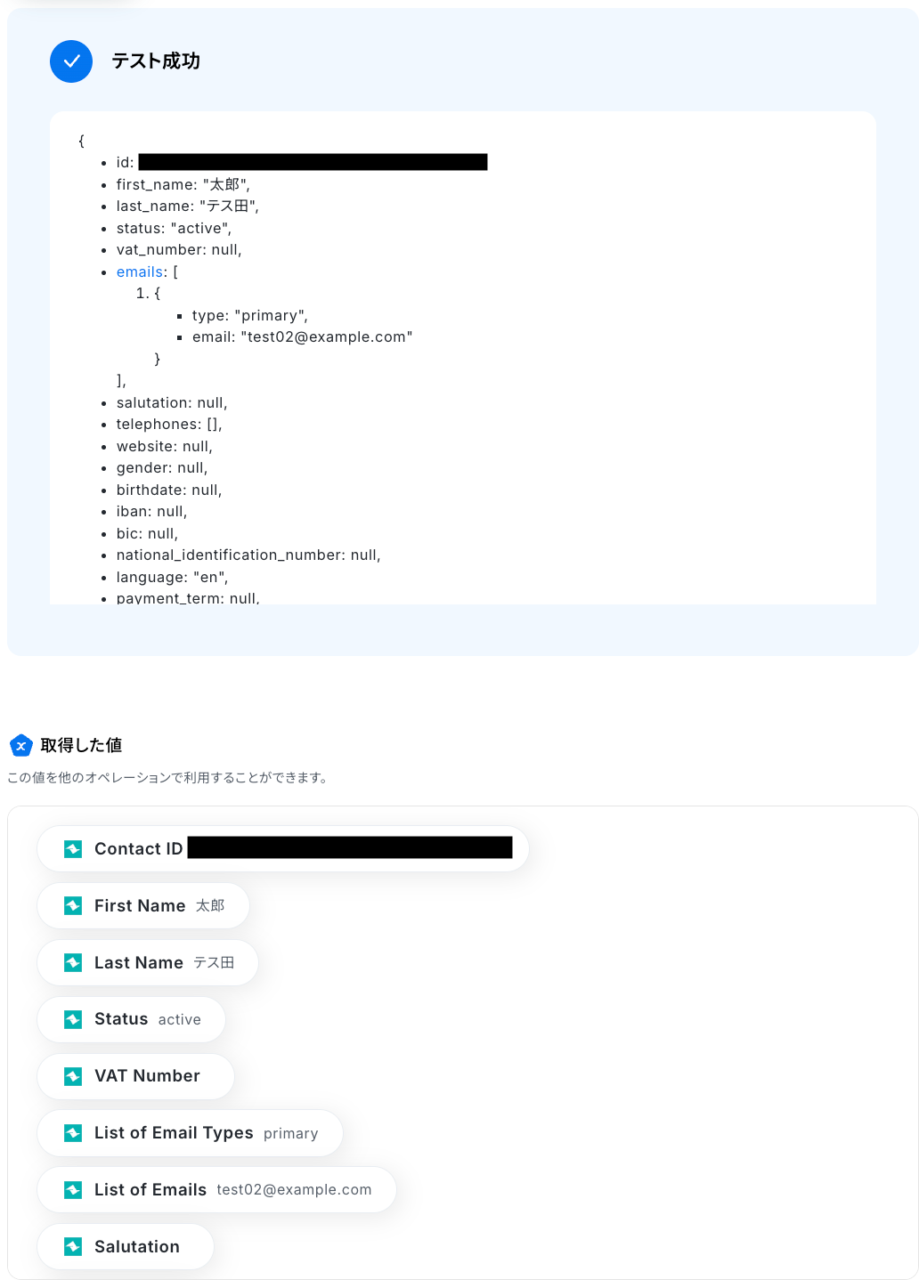 テストに成功すると、Teamleaderに作成されたContactに関する情報が表示されます。