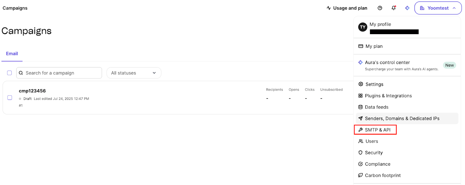 アクセストークンに入力するAPIキーは、Brevo画面右上のアカウントメニューから「SMTP & API」 → 「API keys」へ進むと取得・発行できます。