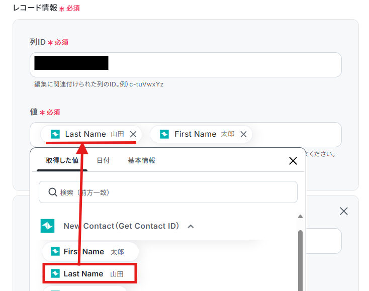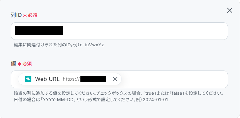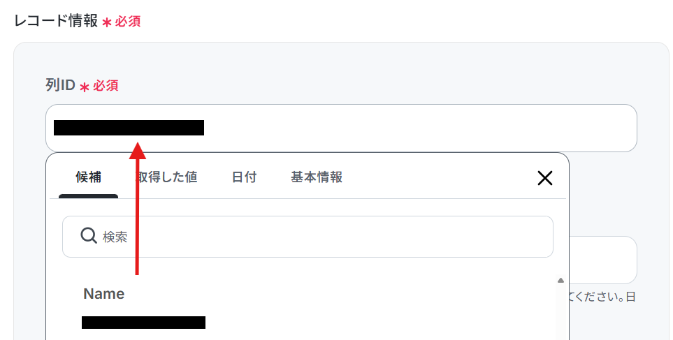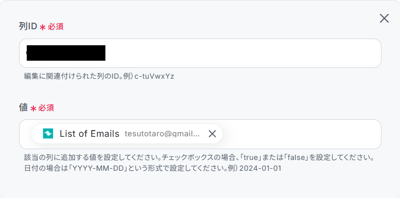 Codaで作成したテーブルの中から、使用したい列の「列ID」を候補一覧から選択してください。