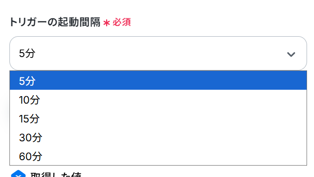 トリガーの起動タイミングは、5分・10分・15分・30分・60分から設定可能です。